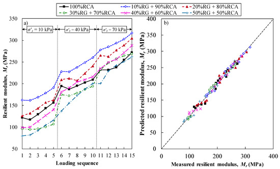 RLT test responses of RG + RCA blends: (a) Mr values and (b) predicted versus measured Mr values.