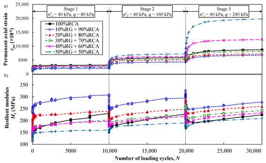 Multistage cyclic permanent deformation responses of RG + RCA blends versus the number of loading cycles: (a) permanent axial strain and (b) Mr values.