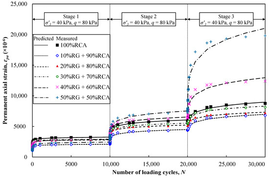 Comparison between predicted and measured permanent axial deformations of RG + RCA blends under multistage cyclic loading.