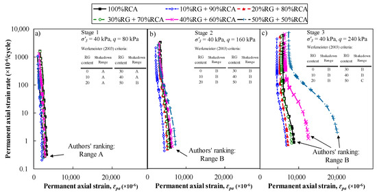 The shakedown ranking of RG + RCA blends according to the Werkmeister [48] criteria in Equation (9) was compared with the authors’ ranking as presented in Figure 9. Conflicting results were obtained in terms of shakedown ranking of 50% RG + 50% RCA at stages one and three. At the first stage of loading, the ɛpa rate of 50% RG + 50% RCA was similar to other samples, which were categorized at Range A based on Werkmeister [48] criteria. Therefore, the ranking of Range A was selected for this stage. Additionally, at stage three the ɛpa rate of 50% RG + 50% RCA was recorded to be on a decreasing trend, although with a lower rate than other samples. The ɛpa rate did not cease to decrease or rapidly increase at this stage. Therefore, the ranking of Range B was selected for the sample similar to other blends.