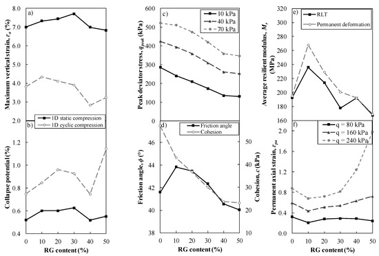 Effect of RG content on deformability, stiffness, and strength of RG + RCA blends: (a) maximum deformation and (b) collapse potential under 1D compression loading; (c) peak deviator stress and (d) shear strength parameters under multistage triaxial compression loading; (e) resilient modulus and (f) permanent axial strain under cyclic triaxial loading.