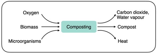 Composting is a process in which microorganisms, in the presence of oxygen, degrade complex organic matter into a simpler and more stable form [,]. Microorganisms feed on the organic substrate and produce CO2, water, and heat as by-products of respiration [] (Figure 2). This process reduces the volume of the waste material, and forms compost, a highly stable humus-like substance rich in plant nutrients.