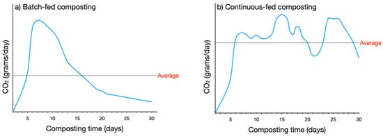 Typical carbon dioxide (CO2) evolution pattern in (a) batch-fed vs. (b) continuous-fed composting systems. In batch-fed composting, CO2 evolution is more variable as feedstock is composted in batches without adding new feedstock to the composter. In contrast, the CO2 evolution from continuous-fed composting is more stable as fresh feedstock is added regularly to the composter.