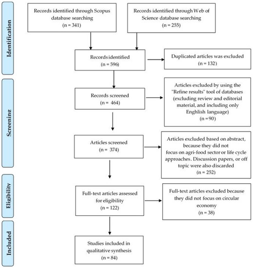 Searches on Scopus and WOS databases led to 341 and 255 articles, respectively, for a total of 596 papers. Duplicate papers were excluded, resulting in 464 documents, which have been subjected to a screening process. A first selection was made by using the “Refine Results” tool of the databases used to exclude review and editorial material and include only the English language. Then, only applicative indexed references were taken into consideration. A second screening was performed based on the content of abstracts, excluding discussion papers, or off-topic and studies that did not focus on the agri-food sector or life cycle approaches. In so doing, 122 articles were assessed for eligibility by reading the full-text in-depth. Studies not directly focused on the issue of measuring circularity quantitatively were discarded.
