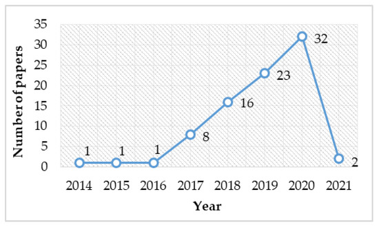 The selected 84 papers were published from 2014 to 2021, as shown in Figure 3. It should be noted that the papers issued in 2021 were already available online in October 2020. The results revealed an exponential increase in the number of publications regarding the application of life cycle methodologies as circularity metrics in the agri-food sector over the last seven years. The first publications, starting from 2014 to 2016 (one for each year), concerning energy recovery from dairy farming [32], recycling food waste for use as feed in aquaculture [33], and the waste management with energy recovery in the anchovy industry [34]. Only in recent years, more specifically in 2018–2020, strong efforts were made toward the development of studies to measure the circularity through LC approaches in agri-food systems. In particular, 16 documents were published in 2018, 23 documents in 2019, and 32 documents in 2020. Nevertheless, as mentioned by Vetroni Barros et al. [17], only a few efforts can be observed toward assessing agricultural systems accounting for sustainability in a circular perspective. Thus, the peak development of this theme has yet to be reached.