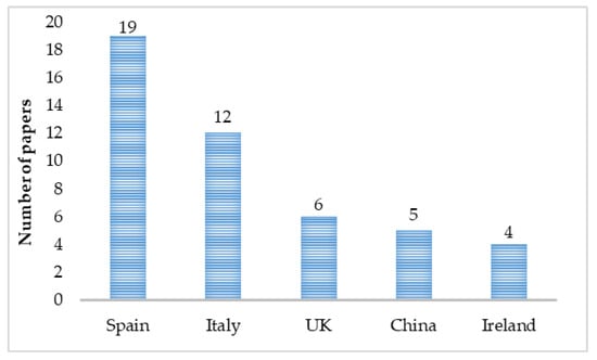 According to the place of case-study application, most publications may be traced to European countries (49%), followed by China, as shown in Figure 4. Indeed, the five highest-ranked origins of the reviewed articles are Spain (22.6%), Italy (14.3), United Kingdom (UK) (7.1%), China (6%), and Ireland (4.8%). These findings were consistent with results reported by Esposito et al. [26], who showed the great interest of European scholars toward the development of CE models also in the agri-food sector. Outside the European continent, China represents the major contributor in researching this topic. This is likely due to the Chinese government’s request to stimulate actions in favor of the environment, also via CE [35]. The interest in using LC tools to analyze CE strategy seems to be growing in Brazil and Sweden with three publications each (for more information, refer to Table S1 in the Supplementary Materials Section).