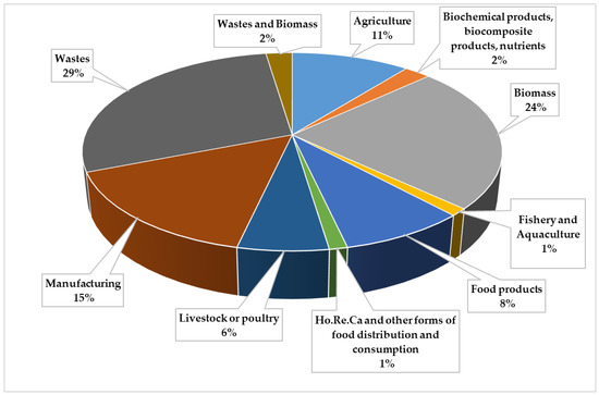 Around 15% of the studies were included in the “manufacturing” field, which includes product production from raw (renewable or non-renewable) materials. For instance, the manufacture of biochemicals and bio-based plastics is one of the strategies promoted by the European Union within the Europe 2020 strategy [54], and the production of bio-based packaging is an effective and promising climate change mitigation strategy [55]. The “agriculture” field, accounting for 11% of the total, enclosed production of fruits and vegetables [56,57] for fresh consumption or industrial transformation [58] (raw materials, food, and no food).
