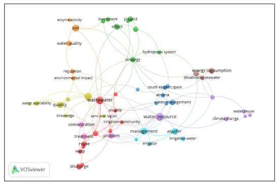 VOSviewer identifies knowledge components (words) as nodes to be included in one cluster, with the number of clusters determined by a resolution parameter. The size of nodes indicates the frequency of occurrence. The curves between the nodes represent their co-occurrence in the same abstract. The shorter the distance between two nodes, the larger the co-occurrence number of the two words. The color indicates the intensity of the co-occurrence: red, blue, green, and yellow clusters are those including more words co-occurring by abstract. The higher the value of the parameter, the larger the number of clusters. In this case, nine clusters were identified, of which four (red, blue, green, and yellow) concentrated the higher number of co-occurring words. The red cluster is focused on reclaimed water experimental contributions, whereas the blue cluster is focused on water management, the green cluster on water infrastructure and investment, and the yellow cluster on water quality standards. In addition, the knowledge structure is based on the position, connection, and distance between clusters and nodes. The closest nodes and central positions illustrate a close nexus between topics: the red and blue clusters are central and close to nodes about reclaimed and desalinated problems (pink cluster), and irrigation use (teal cluster), or energy consumption (brown cluster), but far from topics such as climate change (lilac cluster) or soil analysis (orange cluster). A deeper analysis of the literature review is provided for each topic in the following section.