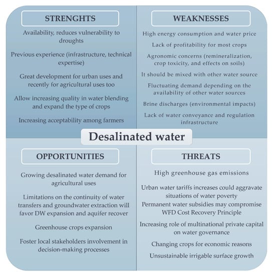 Many investigations have indirectly analyzed issues related to desalination management, on both regional and local scales. On the regional scale, to prevent the underutilization of desalinated water when cheaper water sources are available, long term take-or-pay contracts were signed between agricultural and urban users and desalination plant managers [113]. The intention is to reduce the significant variability in the desalinated water cost that depends on the production rate of the plant, guaranteeing the payment for the amount agreed in the contract and the operation of the plant at the projected capacity [110]. However, in some cases, agricultural users have complained about clauses in these contracts that impose surcharges if the consumption exceeds or does not reach the assigned provision, about the variability of the desalinated water price, and, also, concerning the lack of suitability of the desalinated monthly water supply, which is a uniform volume, for the seasonal variation in the irrigation needs [44,45].