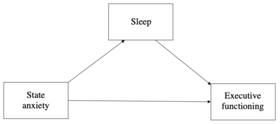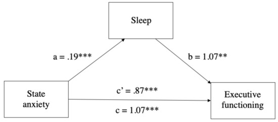 Finally, in reference to the mediation analysis (#1), the first analysis examined the indirect effect of state anxiety (IV) on executive functioning (DV) through sleep (MedV). Results revealed significant effect of the IV on the MedV (a: B = 0.19, SE = 04, 95% CI [0.12, 0.26], p = 0.001), the MedV on the DV (b: B = 1.07, SE = 0.37, 95% CI [0.33,1.81], p = 0.005), and the total effect of the IV on the DV (c: B = 1.07, SE = 0.15, 95% CI [0.78, 1.37], p = 0.001). Although the direct effect of IV on DV was significant (c’: B = 0.87, SE = 0.16, 95% CI [0.56, 1.19]), there was also a significant indirect effect of the IV on the DV through the Med V (a*b: B = 0.20, SE = 0.07, 95% CI [0.06, 0.35]) (Figure 5).
