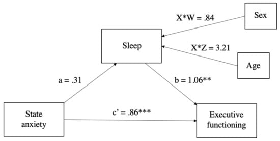 Furthermore, in regard to the hypothesis on moderated mediation (#2, see Figure 2), in order to test whether the indirect effect depends on age (ModV1) and sex (ModV2), coefficients were estimated independently in two regression analysis using bootstrapping. First, sleep (Me) was regressed on state anxiety (IV). Subsequently, executive functioning (DV) was regressed on sleep (MedV) and state anxiety (IV), and age and sex as moderator variables (ModV1, ModV2). An overall effect of the IV on the MedV is a necessary precondition for moderated mediation. A significant effect of age and sex (ModV1, ModV2) on executive functioning is only indicative of moderated mediation if state anxiety (IV) affects sleep (MedV).
