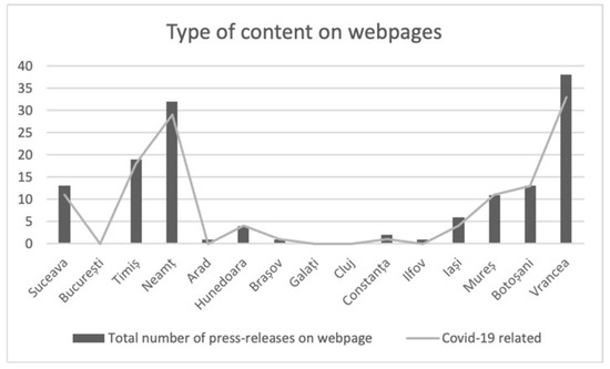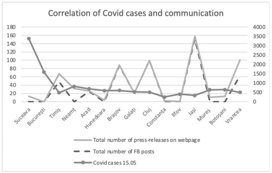 Our research aimed to determine whether there was a correlation between the number of health incidents and the amount of information communicated on the media section of institutional websites and/or disseminated via social media channels. Figure 1 highlights the fact that no such correlations can be traced, and that in some cases exactly the opposite behavior can be seen. For example, the most problematic districts—Suceava and the national capital, Bucharest—had no Facebook page during the analyzed period and posted only a couple of press releases. Furthermore, the highest number of press releases was published on the webpage of the DPHA for Botosani, which was the least infected at the beginning of the lockdown period. Therefore, our assumption that the efforts to keep the community informed would be enhanced in the most affected regions was partially invalidated. Further findings point to a reluctance to communicate.