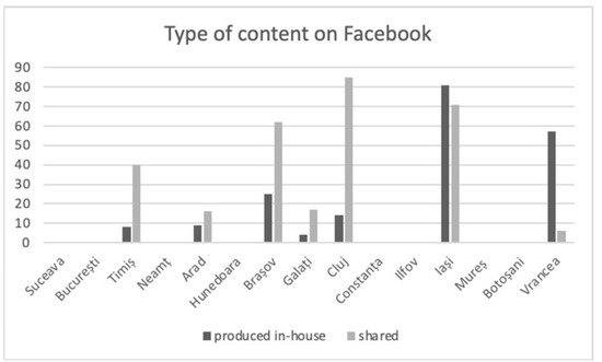 The type of content posted on Facebook is also an indicator of strategic communication with the public. Roughly one third of the content was produced in-house, with only two districts having more in-house content than shared content. An in-depth analysis showed that the “courage” to put a mark on the posts grew with experience, as most FB pages were no older than one year, except for Iasi and Vrancea, which were created in 2017 (31 August and 6 November, respectively).