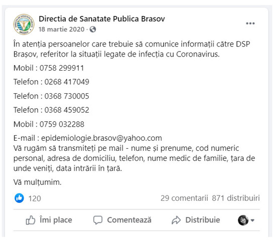 For example, DPHA Brasov held the record for the most shared post. As can be seen in Figure 10, the information posted at the beginning of the lockdown (18 March) was shared 871 times. It contained contact information that people lacked at the beginning of the pandemic.