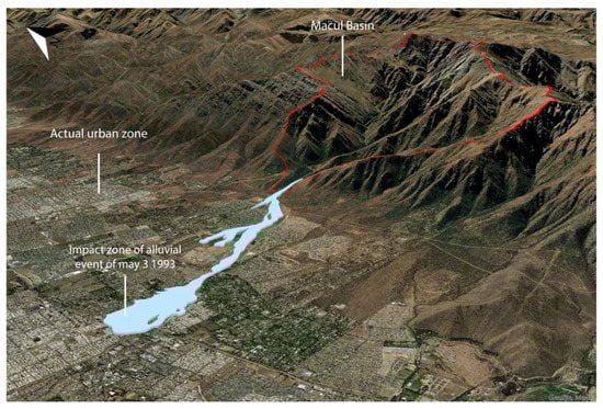 The memory of these events is still present in the community today, standing as a major sociocultural marker in affected neighborhoods []. Since the catastrophe, the area has undergone intense demographic transformations, including rapid urbanization and gentrification processes []. This has not reduced, however, the likelihood of a similar event today. Research has confirmed that anthropogenic modifications in the basin mouth, particularly the loss of ground waterproofing due to piedmont urbanization, directly affect the quantity and speed of water flows as well as the hydraulic characteristics of mountain sediments, configuring an important source of alluvial susceptibility []. Additionally, the expected effect of climate change on the hydrometeorology of the area will likely mean a decrease in rainfall and flow levels, as well as an increase in annual temperatures [,,,]. This could have important effects on the occurrence of floods and flow-type landslides by contributing to the increase in the elevation of the 0 °C isotherm. Furthermore, as an increase in the frequency and/or intensity of warm storms is expected, these can produce runoff with high amounts of sediment in shorts periods of time.