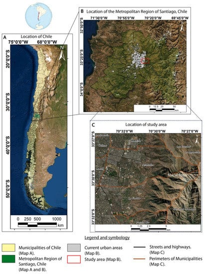 Location map of the Macul basin. (A) Chile location map on a national scale. (B) Location of the Metropolitan Region of Santiago, Chile. (C) Location of the study area that includes the perimeter of the municipalities of the Metropolitan Region.