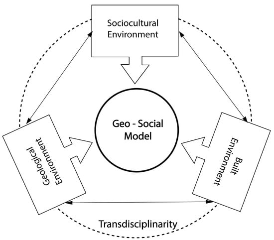 The Geo-Social Model takes an explicit transdisciplinary perspective (Figure 2). By embracing a holistic approach, the model assumes, in ontological terms, that environmental, social, and built systems are inextricably coupled. Epistemologically, it assumes that co-produced and collaborative knowledge allows for mutual learning, better account of uncertainties, and better policy decisions [].