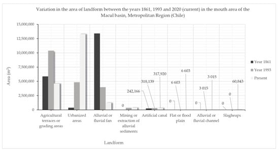 The geomorphological characterization using landforms resulted in the identification and zoning of 18 types, representing denudational, structural, fluvial, and alluvial geomorphological environments and anthropogenic environments (Table 5). These landforms represent surface forms with their own distinctive characteristics of the basin, among them the Sos structural mountain range, which is characterized by the great structural influence of the Andes mountain range translated into topographic prominences of mountainous and elongated morphology with steep to abrupt slopes (Sesso and Seslso), which provide direct runoff in addition to high flow velocities and possibly dragging of material. In addition, Sos includes a significant number of landforms with denudational and fluvial and alluvial environments (Dlcdra, Dus, Dflc, Duf, Fffp, Frt and Fac), which are prone to be affected and contribute to debris flow towards low slope areas, which are characterized by an important anthropogenic influence, represented in this case by the settlement of urban constructions on the alluvial fans of the mouth area (Au-Faf). This is quite relevant, taking into consideration that the alluvial fans (Faf) indicate historical and/or recent discharges of alluvial material, therefore they are indicators of areas of susceptibility to the impact of this type of phenomena; however, it is highly populated. The results of multitemporal landform analysis (Figure 5 and Figure 6), allowed us to identify its evolution in terms of influence and modification of the surface of this particular area, resulting in an initial tendency from 1881 to settlement in areas relatively far from the apex of the outfall area, even with a low percentage of Au areal. This is quite different from the current scenario, which resulted in a strong tendency to an increase of Au and Aatg settled in Faff, towards areas increasingly closer to the Macul basin (apex of the mouth area), some of them even being located near Aac (Figure 6), this being coherent based on records of urban expansion in the foothills of the Cordillera (Section 3.3.2).