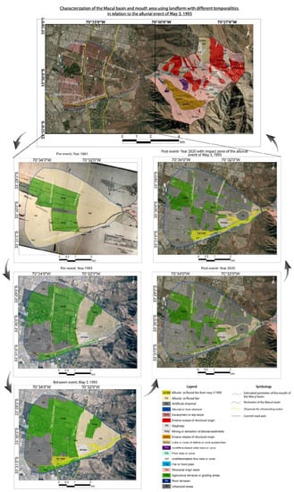 Multitemporal map of landform of the total Macul basin. The black arrow indicates changes in temporality.