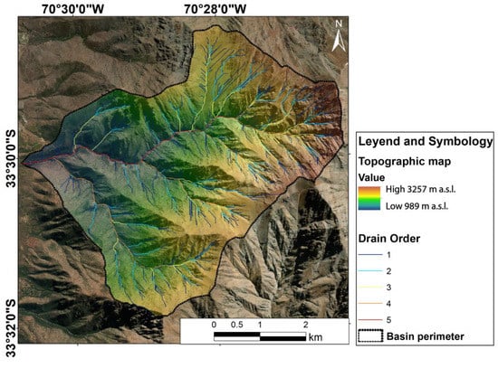 Macul basin, where the topographic map is shown, in addition to the result of the delimitation and obtaining of the perimeter and area of the basin and the generation of the drainage networks according to their orders based on the methodology of Strahler [] by means of morphometric analysis.