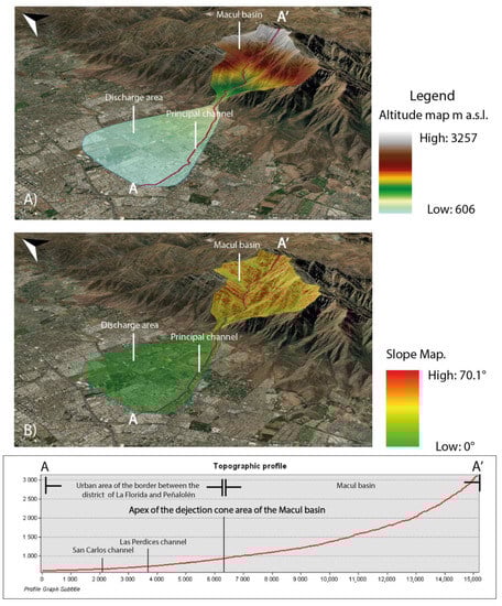 Morphometric maps of the Macul basin, Metropolitan Region (Chile). (A) It represents the topographic map with units m a.s.l. (B) Map of slopes in units of degrees. The topographic profile represents the height trends of the main channel, related in turn to the location of some urban areas.