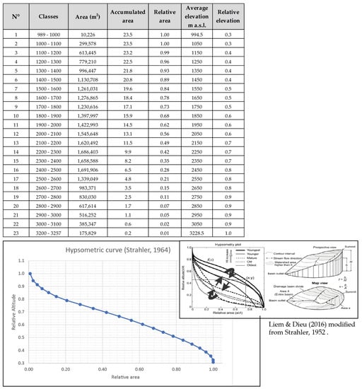 Relief Parameters (Table 8): They indicate that the Macul watershed has an absolute unevenness (H) of 2066 m a.s.l., in addition to having an average slope (Sm) of 62.3% (31.2°) and maximum and minimum slopes of 276.3% (71.1°) and 0%, respectively, which can have repercussions on important rainfall runoff velocities, which can drag important sedimentary material towards areas of lower slope (Figure 8). On the other hand, the Hypsometric Curve (Figure 9), according to Guerra and González [], allows estimating the state of potential dynamic equilibrium of the basin, under the hypothesis that this function relates altitude with area, therefore it changes with time as the basin undergoes denudation; on the other hand, it can relate the differential activity between the processes of tectonic construction and degradation by erosion, activities not necessarily related to the age of the basin. The results indicate that the Macul basin (QM) is in an intermediate phase between a mature basin and a young basin, which in turn can be related to the relationship with the tectonic uplift of the Andes Mountains representing the endogenetic processes that affect it, together with the modeling of the surface through exogenetic processes, which translates into the denudation and alluvial and fluvial environment of the basin, represented by the presence of active transport of the basin to smaller areas.