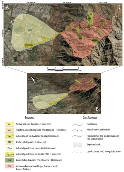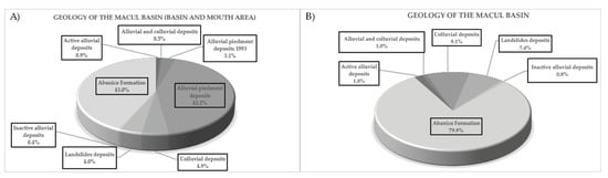 Areal analysis of the geological units of the Macul basin. (A) Basin and mouth area. (B) Only the Macul basin.