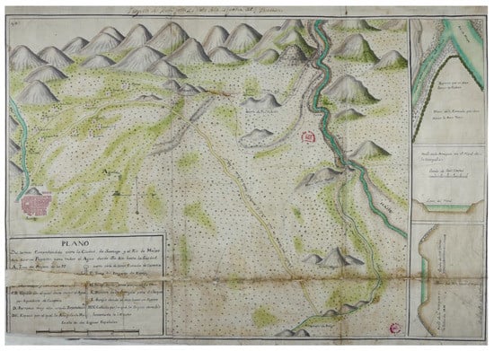 - AHN. Plano del Terreno Comprendido entre la Cuidad de Santiago y el Río Maipo con Diversos Proyectos para Traer Agua Desde alto río Hasta la Cuidad/José Pizarro [Material Cartográfico]. 1742. Available online: http://www.bncatalogo.gob.cl/F/U45XAUQJTC2DJMPYR57A75RMBR41CVBPEMR8DQ3EAGB1BD6G3V-39505?func=full-set-set&set_number=006801&set_entry=000003&format=999 (accessed on 13 October 2020).