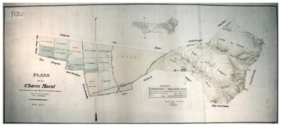 - Borja Solar, F. Plano de la Chacra Macul de la Testamentaria de Doña Mercedes Gandarillas de Larrain [Map]. Available online: https://www.bibliotecadigital.uchile.cl/discovery/delivery/56UDC_INST:56UDC_INST/12173307140003936 (accessed on 10 October 2020).