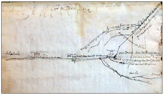 Historical sources refer to the connection of QM with the Zanjón and also the construction of a channel to connect the Maipo River with the Mapocho to avoid agricultural droughts [] (p. 91). In 1742, it was already indicated that there was a need to open up a ditch in the foothills of Macul to this end (Figure 12). In 1772, it was pointed out that there was “a ravine over which it was necessary to build an aqueduct that was to join the southern and northern rivers [...] which was also open, over an extension of several blocks, with very little time left to reach the Zanjón” (Emphasis added) [] (p. 46). Around 1820, it was insisted that “six drains be opened from the Ugareta gully to the Mapocho, in the watering hole [...] in the Macul estuary [...] and at other points as necessary to prevent the flows” (Emphasis added) [] (p. 84). Furthermore, in 1861, the indication of a “channel to be opened to the waters of the stream” was reiterated (Emphasis added) (Figure 13).