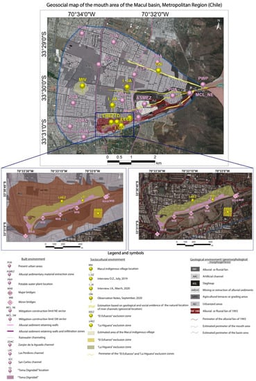 - Beyá, R. Prácticas de Apropiación y Significados Atribuidos al Paisaje Fluvial en Riesgo y su Incidencia en la Vulnerabilidad ante Desastres Socionaturales. Caso de Estudio: El Parque Natural Quebrada de Macul; Tesis para Obtener el Grado Académico de Magister en Asentamientos Humanos y Medio Ambiente; Instituto de Estudios Urbanos y Territoriales Pontificia Universidad Católica de Chile: Santiago, Chile, 2019. [Google Scholar]