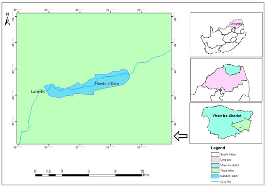 The study area is Nandoni Dam (22°56′45″ S and 30°20′07″ E), which was constructed over the period 1998–2005. The dam falls under Ward 18 and 19 of Collins Chabane Local Municipality and Wards 19, 20, 26, 36, and 41 of Thulamela Local Municipality in the Vhembe District Municipality in Limpopo Province of South Africa (Figure 1).