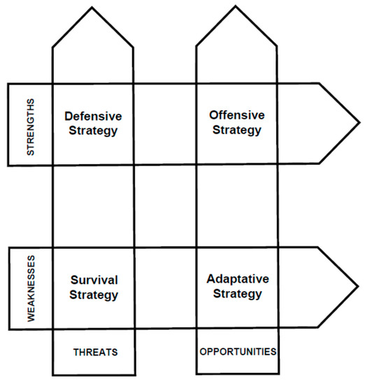 This analysis allows the strategic diagnosis of a company to be established. Its objective is to specify, in a matrix, the strong and weak points of the company (expressions of its competence or capacity to generate and sustain its competitive advantages), as well as the external threats and opportunities, and, from their interaction, those strategies that, in a coherent way, make it possible to achieve an adequate adjustment between the internal capacity of the company and its external competitive position. SWOT analysis tries to identify to what extent the current strategy of the organization, and more specifically its strengths and weaknesses, is relevant and enables it to face the changes that are taking place in the economic environment. The SWOT matrix was defined by Koontz and Weihrich as a conceptual structure for systematic analysis which facilitates the comparison of external threats and opportunities with the organisation’s internal strengths and weaknesses [52].