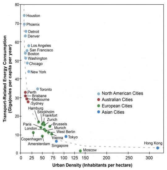 In Indonesia, a high flow of motor vehicles was observed due to growing urbanization and prosperous economic growth. The detailed study of the feasibility of transit development revealed that it can help in achieving the extra benefit of urban environment quality, with basic benefits related to its development such as the reformation of land use growth and an increase in the mode share of public transport [48]. Densification can address the prevailing concerns of developed nations e.g., environmental footprints and energy. This can be achieved through the introduction of public transportation, which results in a decline in consumption of energy and air pollution. The issues of environment and energy-related to transportation and land use are interdependent and smart growth strategies are a way to solve the problem of environment and human health. TOD can help in reducing greenhouse gas (GHG) emissions and building life-cycle energy consumption by 9%–25%. The overall impact of GHG can be reduced by 36%, respiratory impacts by 8.4%, and smog by 25% through the proper planning of transportation and buildings. This planning includes reducing automobile use and improving access to the transit facility. Thus, it can be concluded that a proper transportation system and land use development (higher density) that reduces dependency on an automobile can help in achieving environmental benefits [21]. Figure 4 shows the relationship between urban density (persons/hectare) and transport-related energy consumptions. A decline in transport-related energy consumption can be observed with an increase in urban density e.g., Hong Kong, with the highest urban density, has the lowest transported-related energy consumption. Similarly, investment in transit systems provides the city administration with an opportunity to transform their urban areas and to reduce transport related energy consumption, which ultimately helps to create environmentally friendly neighborhoods. One of the ways of doing this is to use transit investment as tool to encourage transit oriented development.