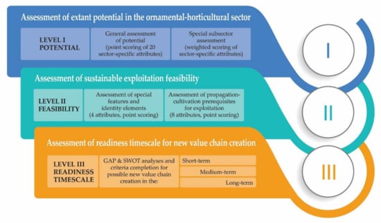 Simplified overview of the multifaceted scheme used for the evaluation of the local endemic plants of Crete (Greece), Mediterranean coast-Rif of Morocco and Tunisia in the ornamental-horticultural sector. For attribute types, individual attributes and scores applied in Levels I and II, see Table 1. For Level III evaluation, see conditions that should be met in Table 2, after SWOT and GAP analyses (Figure 2; Figure 3, respectively).