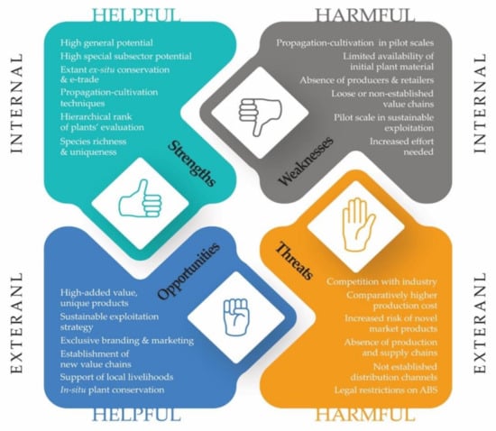 The application of the criteria mentioned in Table 2 resulted in 23 Cretan endemic taxa that can be sustainably exploited in the medium-term. The availability of propagation material for these plants can be probable either due to some ex situ conservation actions in place or accessibility of wild-growing populations which may facilitate the production of documented material. Legal restrictions related to ABS policies may impose some risks in accessing wild populations, but these can be overcome due to commercial interest after prior informed consent. Most probably local forest authorities may authorise collections of initial propagation material for further commercialisation in the frame of the EU Directive 511/2014. The upscaling of existing pilot attempts to address commercial demand for these new taxa is deemed as possible on the basis of successful rapid propagation techniques and pilot cultivations already examined, e.g., [44,45]. If some research gaps (e.g., agro-processing, cultivation practices, fertilisation regimes, agronomical aspects etc.) are bridged carefully, the attraction of stakeholders, producers, retailers and distribution channels can be well-thought-out as possible. Consequently, the value chains for these taxa can be considered as reachable in the medium-term.