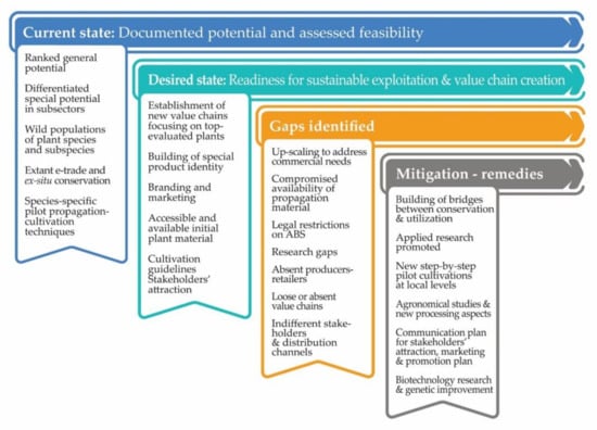 Furthermore, the Cretan calamint (Calamintha cretica) and the Cretan mountain tea or “Malotira” (Sideritis syriaca subsp. syriaca) scored 69.44% and 66.67%, respectively, could potentially be exploited in the short-term, despite the fact that these do not actually rank in the highest class of sustainable exploitation feasibility (>70%). It is worth mentioning that S. syriaca subsp. syriaca has been recently proposed as a new industrial crop almost ready to be exploited [42]. In the same line (NUPs scored above-average to high), there are another 15 cases of Cretan taxa that can be exploited in the short-term as they fulfil all the necessary criteria mentioned in Table 3. Up-scaling in cultivation can be easily achieved for these taxa, due to already established propagation techniques and pilot cultivation protocols. For example, Carlina diae has been recently proposed as a new crop with ornamental value [17]; Convolvulus argyrothamnos has been cultivated successfully in pilot scale for many years in Crete as an ornamental plant (Z. Kypriotakis, pers. comm.); Lomelosia minoana subsp. minoana and Scutellaria hirta have been lately promoted for landscaping and gardening [43]; and Bupleurum kakiskalae has already been cultivated successfully at the entrance of the Management Authority of the Samaria National Park in Crete (https://www.samaria.gr/en/home-2-2/, (accessed on 18 February 2021)). Ex situ conservation actions in place are very important for the availability of propagation material for these plants, in order to facilitate the massive propagation of certified plants for commercialization. This can also alleviate possible legal restrictions related to Access and Benefit-Sharing (ABS) policies. The commercial demand and up-scaling of these taxa could be accomplished with the already propagation protocols developed and extant pilot cultivation results in place, e.g., [44,45]. With hardly any or some easily bridged research gaps (e.g., agro-processing), the attraction of stakeholders, producers and retailers can be easy for these taxa, and the possible facilitation by extant distribution channels can be likely reasonable. Consequently, the value chains for these taxa can be considered as reachable in the short-term.