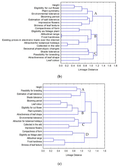 - In the case of the Cretan endemic plants (Figure 4a), three clearly differentiated clusters of attributes were differentiated: Cluster A with most of the attributes related to plant habit (frost hardiness, altitudinal range, blooming period, environmental tolerance, compactness of form, plant symmetry) and two groups with attributes related to perceived value from human viewpoint, i.e., cluster B (collections in the wild, electronic trade over the internet and promotion for botanical holidays, eligibility as foliage plant, impressive flowers, seasonal phenotypic changes, attractiveness of leaf shape, shining of leaf texture) and cluster C (shade tolerance, estimation of salt tolerance, leaf colour, height, eligibility for cut flower, possibility for breeding).