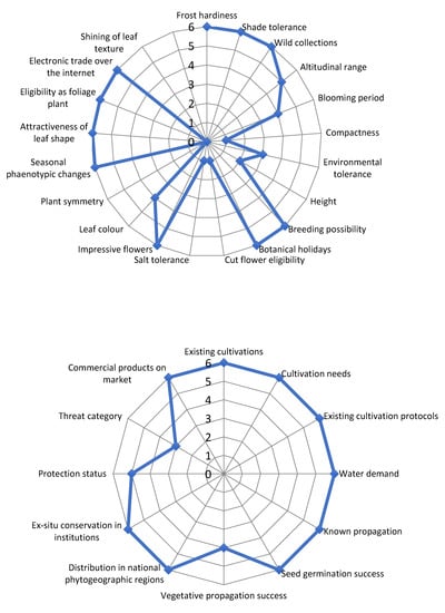 - Definition of attributes types: Among the 32 selected attributes (Table 1), 20 were assessed by the experts as sector-specific, reflecting explicit interest concerning the potential of the target taxa in the ornamental/horticultural sector. In total, 12 attributes (Table 1) were employed as prerequisites of common interest across various economic sectors (e.g., agro-alimentary, medicinal, cosmetics etc.) facilitating the sustainable exploitation of the target-taxa. These were either related to taxon’s special features, i.e., rarity, protection status and endemism, or related to the taxon’s achieved or foreseen propagation and cultivation success.