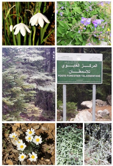 - Khabbach, A.; Libiad, M.; Ennabili, A. Valeurs et Services de la Phytodiversité, Cas de la Flore Vasculaire de la Zone Pré-Rifaine, Province de Taza (Nord-Ouest du Maroc); Editions Universitaires Européennes: Saarbrücken, Germany, 2014; p. 190. [Google Scholar]