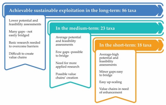 At the third level of evaluation, the above-mentioned prerequisites or necessary conditions were taken into account to designate the readiness timescale for sustainable exploitation of the evaluated focal taxa. This allowed determining if the sustainable exploitation has already been achieved in some cases of taxa, whether this is indeterminable or achievable for others in short-term, medium-term and long-term. The above-mentioned criteria were applied in all cases of the focal taxa, and in each case, a single characterisation was designated (Table S2, see S2).