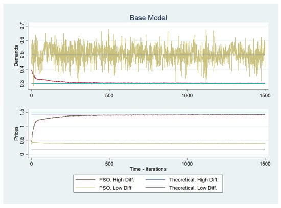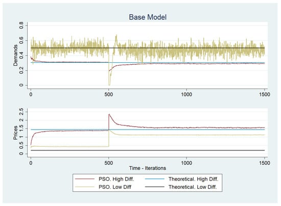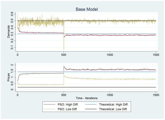 In Figure 1, we depict the average price and demand of the base model at each one of the 1500 iterations. The PSO algorithm reproduces quite successfully the price and demand of the differentiated market. On the other hand, it sets a higher-than-optimal price in the undifferentiated market. This result is also found by [36] using a Q-learning algorithm. Nonetheless, demands are quite volatile in this market, as we observe in Figure 1. Thus, PSO may “learn” to avoid large confrontations by setting prices higher than optimal.