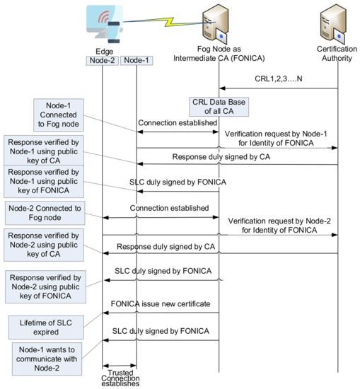 Figure 4 illustrates the messaging between edge nodes, fog nodes, and CA. Initially, it is assumed that the Fog Node contains information about the CRL of all relevant CAs. Node-1 establishes a connection with the Fog Node and verifies its certificate using a traditional certificate verification scheme. Node-1 verifies the certificate of Fog Node using a public key of CA. Once Fog Node becomes trusted and its chain of trust is verified then it may work as an intermediate CA. Now, the fog node is capable of issuing SLC to edge devices. SLC is duly signed by a private key of Fog Node and Node-1 will verify using a public key of Fog Node. Similarly, Node-2 verifies the certificate of Fog Node using a public key of CA. Once Fog Node becomes trusted then it may work as an intermediate CA and capable of issuing SLC to Node-2. SLC is duly signed by a private key of Fog Node and Node-2 will verify using a public key of Fog Node. Now, Node-1 and Node-2 are in the same trusted domain, and the certificate of Fog Node is placed at edge device like other CA’s certificates.