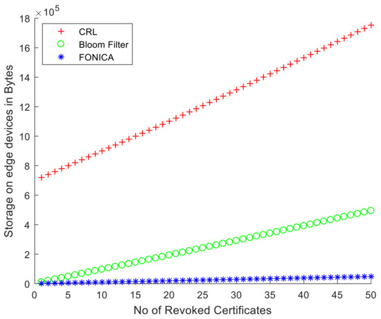 The results from Figure 5 depicting that the bloom filter has improved storage consumption with respect to the CRL scheme. However, FONICA has reduced storage consumption on edge devices because there is no need to maintain a record at edge devices. The FONICA will keep track of revoked certificates and immediately issue new certificates whenever a certificated is reported revoke.