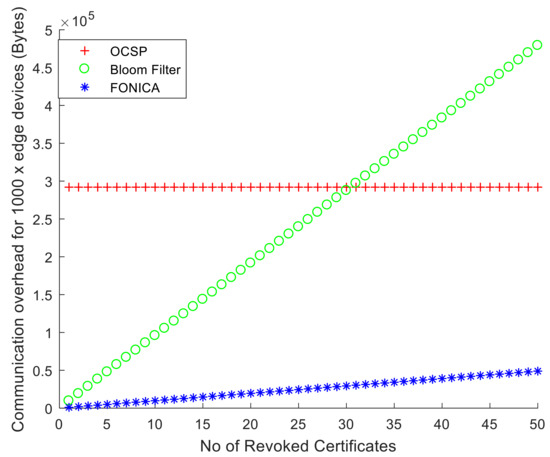 Secondly, we formulate the following equations for the computation of communication overhead for OCSP, Bloom filter, and FONICA. OCSP, the protocol does not have any storage overhead, because it is an online approach. Packet size for an OCSP query is 292 bytes considering both the request and response packet sizes. Equation (6) is showing OCSP request and response size which is 292 bytes while Equation (7) is showing the total communication overhead of OCSP for N edge devices.