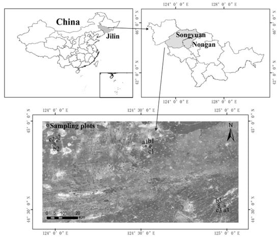 The study was conducted in Guyang Village and Dafu Village of Songyuan City, and Wanshun Village of Nong’an County, Jilin Province (43°53′–44°54′ N, 123°59′–124°59′ E) (Figure 1), which is located in the central Songnen Plain of Northeast China. The study area belongs to the temperate zone, which is a semiarid continental monsoon climate area. The mean annual evaporation of the study area is 800–900 mm, and the mean annual temperature is 4–5 °C [23]. The mean annual precipitation ranges from 370 to 470 mm, with more than 70% of the precipitation occurring during June, July, and August. The soil is identified as Chernozem by Chinese Soil Taxonomy, or as Ustoll by US Soil Taxonomy. The main native vegetation is meadow steppe, which initially covered the whole study area. There is an obvious accumulation of calcium carbonate under the humus horizon. Moreover, the humus horizon in the area is thin. At present, a considerable part of the natural vegetation in the area of Chernozem have been successively reclaimed for farmland, resulting in fertility degradation and acidification of soil.