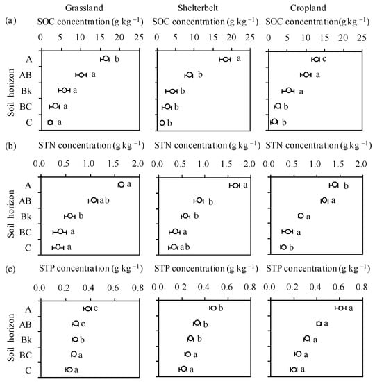 Horizon distribution of (a) soil organic carbon (SOC) concentration, (b) soil total nitrogen (STN) concentration, and (c) soil total phosphorus (STP) concentration in grassland, shelterbelt, and cropland. Error bars represent the standard error of the mean. Within each horizon, different lowercase letters indicate significant differences in the SOC, STN, and STP concentrations among the three land uses (p < 0.05). On the vertical axis, A represents A-horizon, AB represents AB-horizon, Bk represents Bk-horizon, BC represents BC-horizon, and C represents C-horizon.