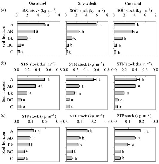 The amount of (a) SOC, (b) STN, and (c) STP stocks in each horizon of the soil profile under different land use types. Different lowercase letters indicate significant differences in the SOC, STN, and STP stocks among different land use types in the same soil horizon (p < 0.05). The error bars are the standard errors. On the vertical axis, A represents A-horizon, AB represents AB-horizon, Bk represents Bk-horizon, BC represents BC-horizon, and C represents C-horizon.