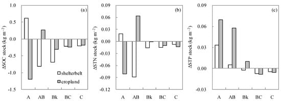 Compared to the grassland, the ΔSOC, ΔSTN, and ΔSTP stocks in cropland and shelterbelt express the carbon sequestration capability of land use changes. Positive values of ΔSOC, ΔSTN, and ΔSTP stocks illustrate carbon, nitrogen, and phosphorus accumulations; however, negative values illustrate carbon, nitrogen, and phosphorus losses. The ΔSOC stocks indicated carbon generally lost in the whole profile after conversion of grassland, with the exception of the A-horizon in shelterbelt and AB-horizon in cropland (Figure 4a). The highest SOC loss was detected in the cropland (Figure 4a), especially in the A-horizon. ΔSTN stocks indicated that nitrogen was lost through the whole profile, with the exception of the A-horizon in the shelterbelt and AB-horizon in the cropland (Figure 4b). In contrast to the ΔSOC and ΔSTN stocks, positive ΔSTP stocks were detected after the grassland conversion to cropland and shelterbelt in the A-horizon and AB-horizon; however, negative ΔSTP stocks were found under Bk-horizon (Figure 4c). The mean ΔSOC, ΔSTN, and ΔSTP stocks of each horizon in the shelterbelt site and the cropland site were −0.26 and −0.33 kg m–2, −0.02 and −0.01 kg m–2, 0.01 and 0.03 kg m–2, respectively.