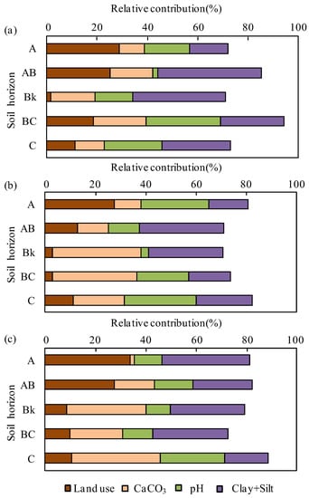 Relative contributions of factors to (a) SOC, (b) STN, and (c) STP concentrations at different soil horizons. On the vertical axis, A represents A-horizon, AB represents AB-horizon, Bk represents Bk-horizon, BC represents BC-horizon, and C represents C-horizon.